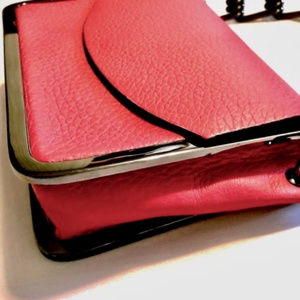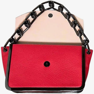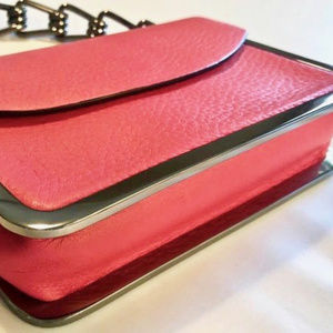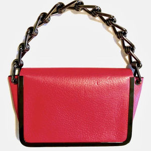 The Reed Krakoff Mini Anarchy leather bag with gunmetal hardware; single bold, weighty chain-link handle and metal accents at edges. Snap closure at envelope front flap. Pale pink leather lined interior has a single slip pocket and could fit necessities for a night out. Handle drop: 4" This handbag is in excellent pre loved condition with negligible signs of wear (hairline scuffs on hardware, teensy scuff on leather -back exterior, minute signs of wear from storage; nothing significant. Clean interior. No dust bag. I've yet to find another one in this color /condition. No offers.