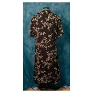 Chic and timeless, this vintage Caron midi dress features a striking cream floral print against a black background. Button-down front with a classic collar and short sleeves. A beautiful piece for collectors or everyday vintage styling. Minor staining around the collar. Needs a good cleaning.
