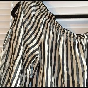 Sheer chiffon top, classic black and white stripes, open shoulder, adjustable waist. Tags were removed so they don't show up. In excellent condition. Size S. ✨Price is firm even with bundles. Bundled with other items to save on shipping. 😊