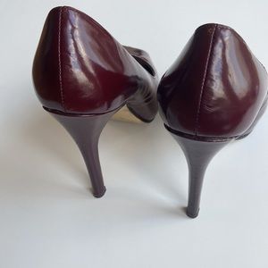 Beautiful burgundy peep toe patent pumps . Great for office.