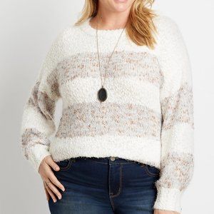 Super soft eyelash fabric, stripe print, long lantern sleeves, straight hem, crew neck, relaxed fit, fabric is stretchy.