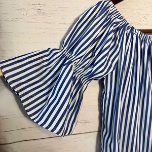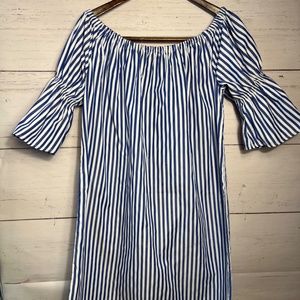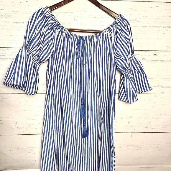 Beautiful off the shoulder nautical striped dress with elastic sleeves. In excellent condition. Never worn but washed once. 100% polyester.