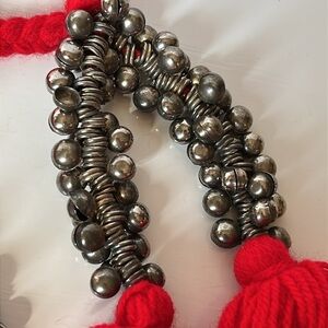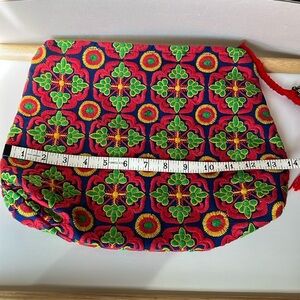 Cleobella large colorful clutch pouch bag with red yarn tassels and bells. In good clean condition with slight wear. Some of the bells have come apart and yarn is shorter in some places on tassels.