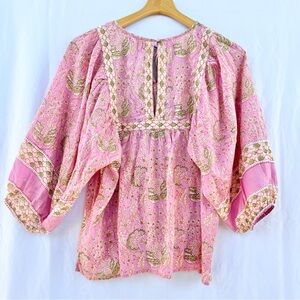 • Large. Split neckline with tassel tie closure. Balloon 3/4 sleeves. Elastic cuffs. Back keyhole with button closure. Sold out. Lightweight, loose, and flowy. 100% cotton. Shades of pink and spring green.