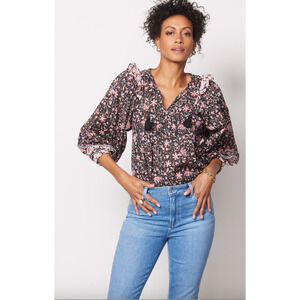 Lurex threads add a subtle shimmer to this feminine floral blouse by Cleobella. Crafted in organic cotton, this puff sleeve top features ruffled shoulders, pintuck detailing at the sleeves and hem, and a split neckline with tassel ties.