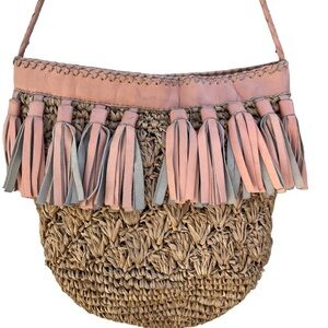 CLEOBELLA RAFIA & LEATHER FRINGE CROSSBODY SHOULDER BAG Pink