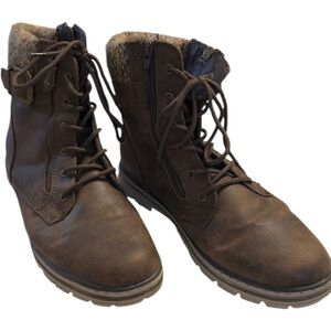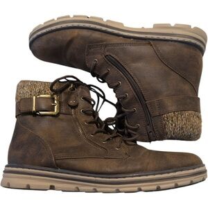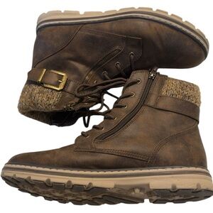 Stylish brown ankle boots featuring a cozy knit cuff and durable design. Perfect for casual outings and adding a touch of warmth to your look.