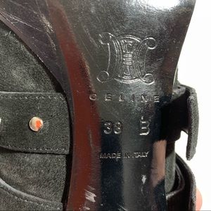 authentic CÈLINE black suede block heel platform mule pumps with buckle detailing at the vamp. EXCELLENT PRE-OWNED CONDITION, light normal signs of prior wear. Shoes have had leather soles professionally reinforced with non-slip vibram rubber sole by the cobbler.