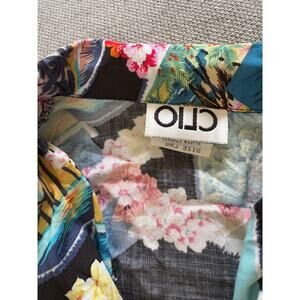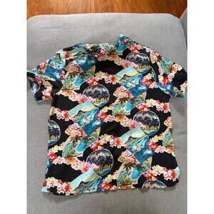 Fun, vibrant CLIO camp / Hawaiian style shirt with tropical island, palm tree, floral, and wave motifs. Lightweight, button-front, short sleeves. Great for vacations, summer, beachwear, or styling as a statement piece.