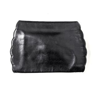 One of Princess Diana's favorite designers - this simple yet elegant leather clutch features scalloped edges and contrast colored piping. Single interior pocket. Zip closure. *There is fading of piping color at corners.