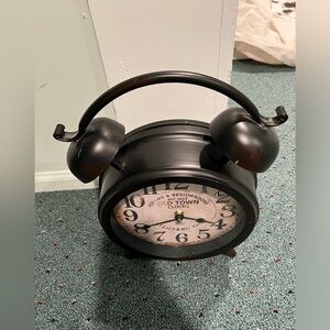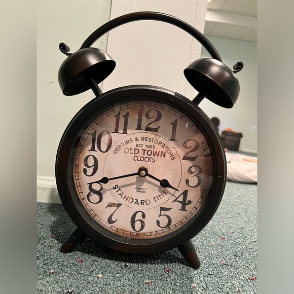 Vintage-inspired clock • wear and tear / scratches are shown in pictures • requires one double AA battery • bells on clock are for show only • FAST SHIPPING • in fair condition • color is a brown / bronze