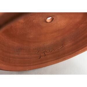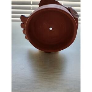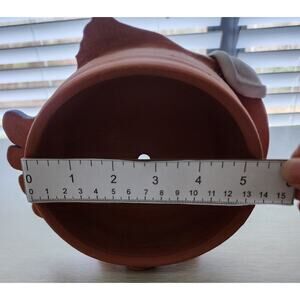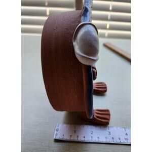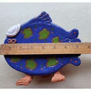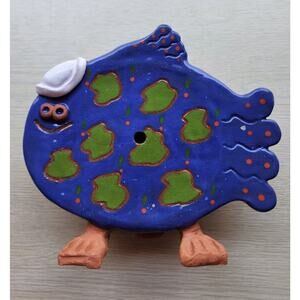 Hand crafted pottery fun fish in blue with green spots and wearing a white sailor hat. It stands on little "fish feet". There are NO CLOCKWORKS INCLUDED. Buyer will have to purchase and insert it. About 7 in height. 7.5 in length. 2" wide.