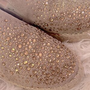 Made in Tuscany Italy. CLORINDA Antinori tan suede slip-on espadrilles. Adorned with sparkling gold jeweled embellishments on tops, and woven rope side decor, the shoes offer both comfort and elegance for any occasion. Very good condition, a little bit of wear on the inside branding logo, and minimal staining in the rope detail as shown in photos. Size 40 or a US Size 9.5
