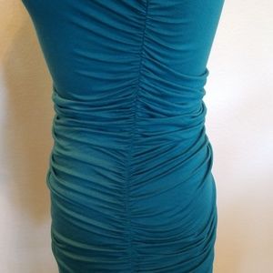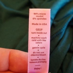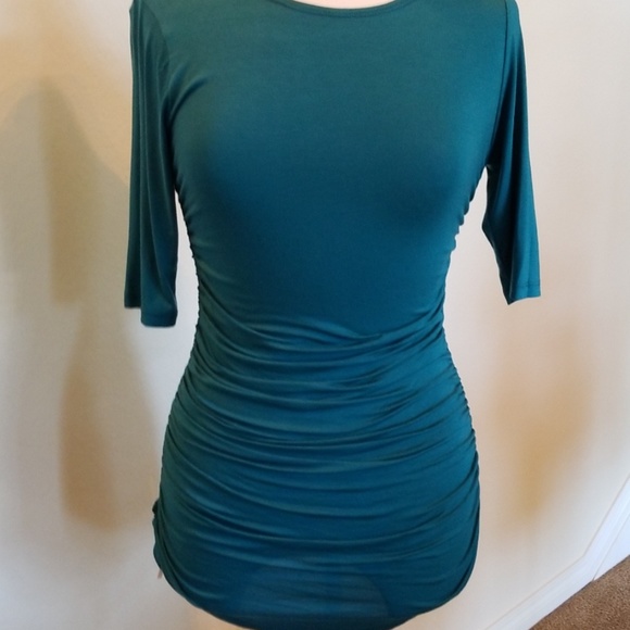 Micro modal and Spandex. Ruched from armpit to hem. Great for layering. Lots of stretch. Color is teal. Bundle and save.