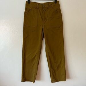 Pants with workwear inspired details made of a soft organic cotton quality with stretch content. Clean style with tonal details and ivory nut button. To create a subtle used look the finished pants are dyed and washed (garment-dyed finish). They are cut for a relaxed fit, mid waist, straight leg, and cropped length. In excellent condition.