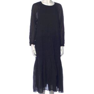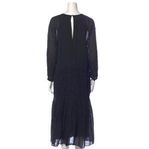 CLOSED shift dress in black. Size XS, maxi or midi length depending on your height. Slightly oversized roomy and comfortable. Pleated and ruffle accents, long semi-sheer sleeve with single button cuff. Scoop neck, button closure at back, lined. Lightweight, versatile and packable. 100% Cotton; Lining 100% Viscose. Machine washable.