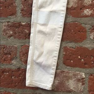 CLOSED made in Italy jeans. Worn once! 98%cotton, 2%elastane. Pretty stretchy. Approximate measurements are listed. Inseam is 33 inches. Waist measures 28 inches with stretch. Rise measures 8 inches. Hips measure about 34 inches. Ankle measures about 11 inches around. Cream colored with white painted horizontal stripes close to the bottom.