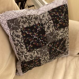 New with care tags. Hand Crafted black and white quilted pillow in a check pattern with just a touch of color. Back side is a coordinating black and white ginkgo leaf print. It measures 15” square. Made in a smoke free home with all new 100% cotton fabrics.