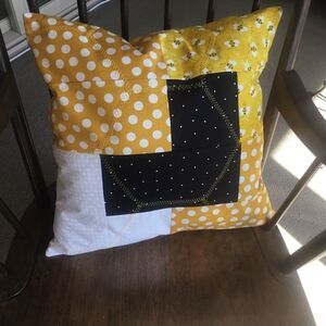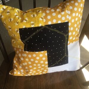 New with tags. Yellow, Black and White Bee pillow is Hand crafted and quilted using 100% all new cotton fabrics and 100% all new poly fiber. Honeycomb patterns feature 4 coordinating fabrics and gorgeous hexagon quilting. Back side is solid yellow fabric. This beauty measures 18” x 18” square.