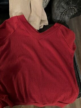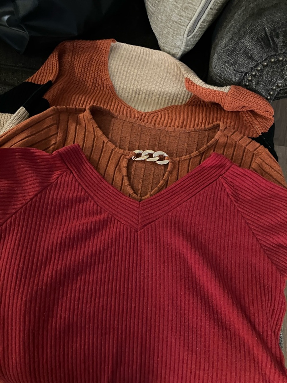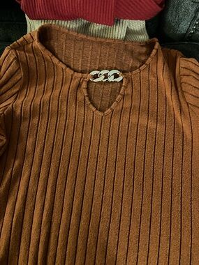 Soft ribbed V-neck sweater in a rich brick red. Lightweight stretch knit for easy layering and all-day comfort. Versatile silhouette that pairs well with jeans or skirts. Color: brick red.also a pretty rust colored ribbed top with pretty chain embellishment on neckline and a warm tri colored hearthstone v neck sweater