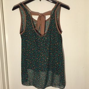 😻😻❤️💋Adorable sheer green and brown leopard tank with brown ribbon back. Pair this with a beige tank underneath and some blue jeans and you got yourself a perfect day into night outfit.