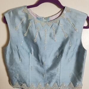 Vintage sleeveless formal top. Trim with crystals top is silk duppioni so slubbing and some mild color variation. Metal zipper. I haven't seen this in this garment but FYI.