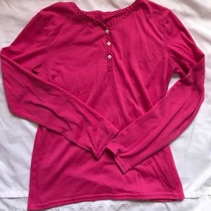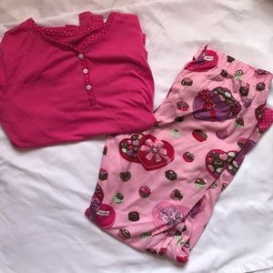 - Dark Pink top with white polka dots along the collar. Matching pants with chocolate designs