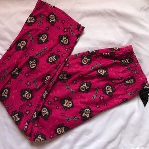 - Black "Boo" sequin top with magenta fleece pants that has skulls