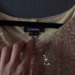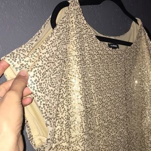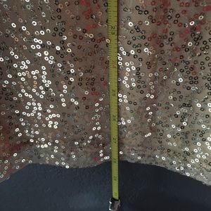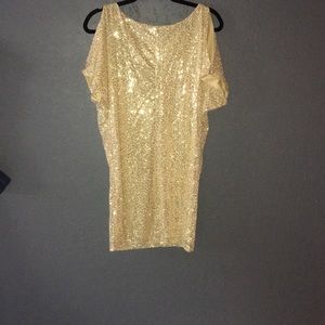 Sequenced, gold, fun dress. This dress fits snug around the hips and thighs while being a little bit loser at the top. Very nice occasion dress! Would be perfect for New Years ๐