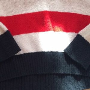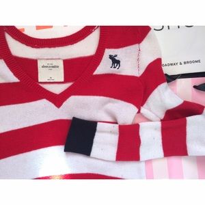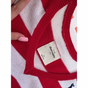 Red & white Abercrombie Sweater with navy cuffs & navy stripe @ bottom. Worn a few times, great for layering, & for winter time. Could be used as a "Where's Waldo" costume (haha!). Can fit a women's XS