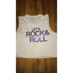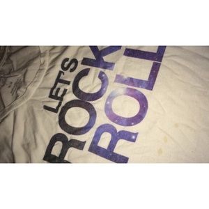 A white cropped tank top with purple galaxy lettering. Only flaw is a minor stain in the front (shown above), but not noticeable at all :)