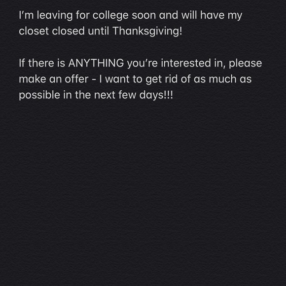 Please make an offer on anything you’re interested in! Closet will be closing until Thanksgiving :) thank you!!!