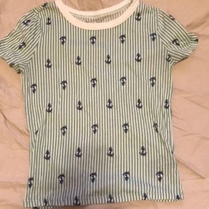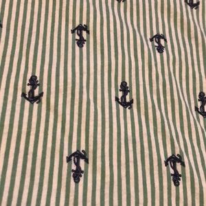Vintage looking tee with navy anchors & green and white thin stripes. Very soft and lightweight.