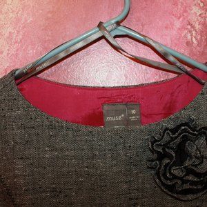 Super cute, grey muse dress with floral accent on the chest and lace accent around the waist. Fully lined for your comfort. Size 10. Like-new condition with no signs of previous wear whatsoever!