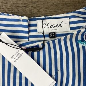NWT CLOSET LONDON BLUE STRIPE FLORAL BELL SLEEVE BLOUSE, size 6. New, never worn. Keyhole I’m back. See pictures for measurements and fabric content.