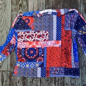 Super flattering, gathered at waist. Short sleeve, back zip, lined. Hits just above knee.