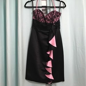 Black Satin Betsey Johnson Dress with Lace and bead details. Size 2. Removable strap. Perfect prom dress, formal dress, homecoming dress, or little black dress. 1950's style. Pinup doll style. Little black dress with a splash of pink.