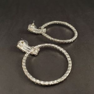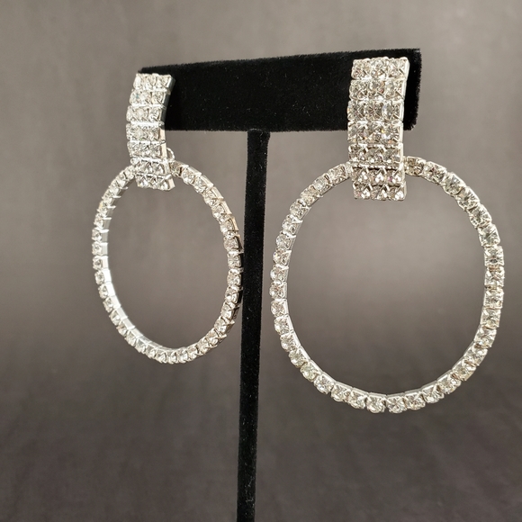 Silver toned post earrings, with silver rhinestone circle loops. About 2.5" tall. Not very heavy.