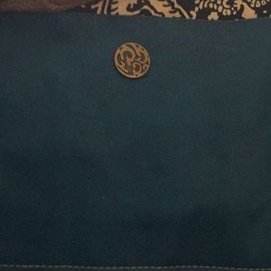 Black and white paisley cloth with teal blue leather and studs purse. Zipper to get inside two small pockets inside and one large zipper pocket inside. The straps are adjustable and a zipper pocket on the back. The blue faux leather part looks like a pocket but it's not. The straps are made from a burlap type fabric. Never used NEW