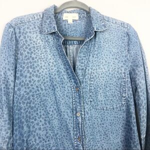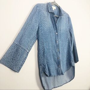 Adorable blue Chambray shirt with spots that make it look leopard print. Unique sleeves. High low hem. Great preowned condition. One small area in the fabric that looks a little white but I got it this way. Size XS.