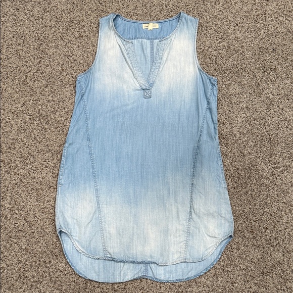 Stylish sleeveless tunic with a light blue wash. Perfect for casual wear. Soft and comfortable fabric.