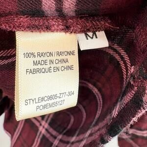 V-neck with button, crossover draped front, hi-low hem. Super soft rayon in a wine red / purple plaid.