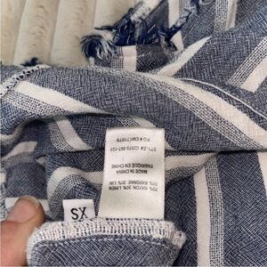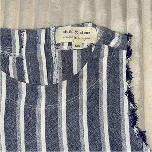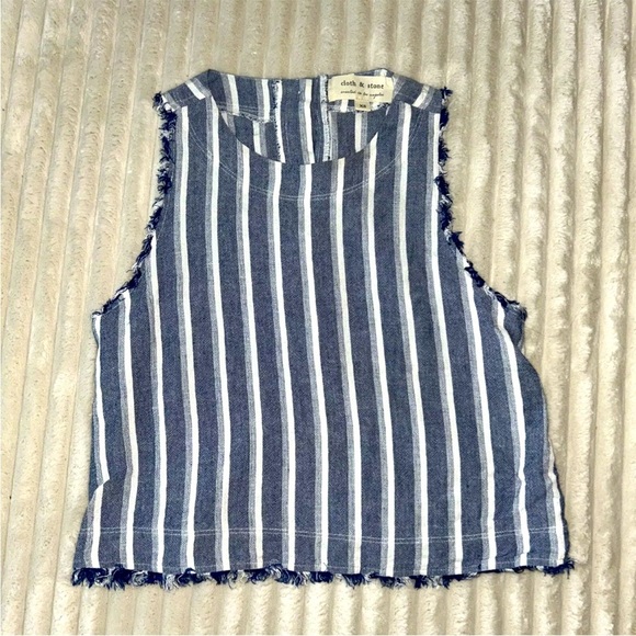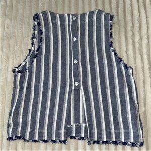 This is a Cloth & Stone Women's Fray Button Back Tank Top in size XS. The tank top features a sleeveless design with a round neckline and colorful blue stripes or plain pattern. It has a stylish button back detail and is suitable for casual occasions. The garment is machine washable and made of a material that is unspecified. This tank top is a versatile and trendy addition to any woman's wardrobe.