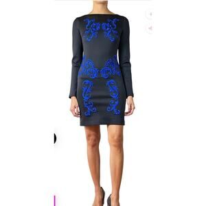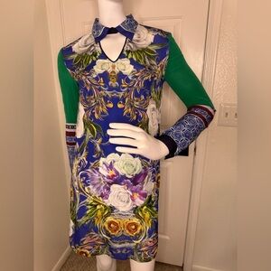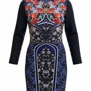 CLOVER CANYON BAROQUE EGG LONG SLEEVED STRAIGHT BLUE RED SHEATH DRESS SZ S