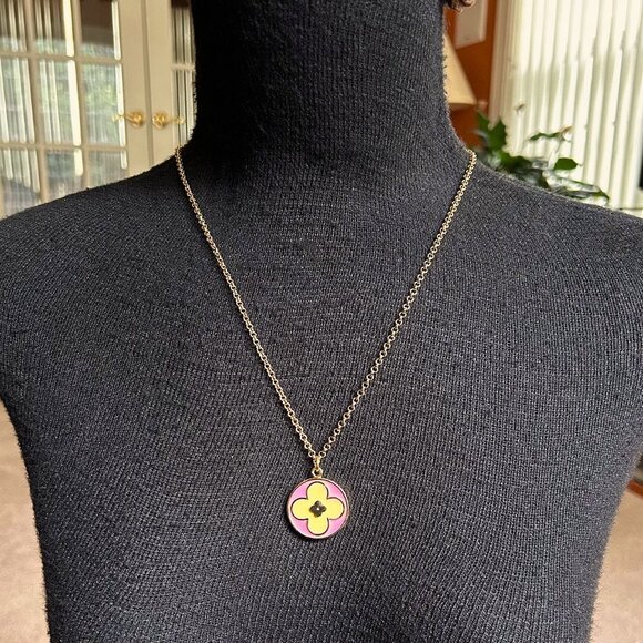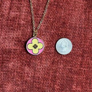 CLOVER Charm Pendant on 18K Gold 22 inch Chain Necklace Pink and Yellow