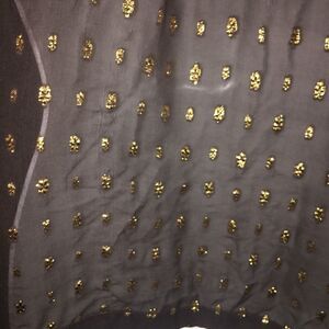 Grey wool blend front with buttons and pockets, back panel is silk with gold polka dots. Has a minor barely noticeable snag (see pictures). Size Medium