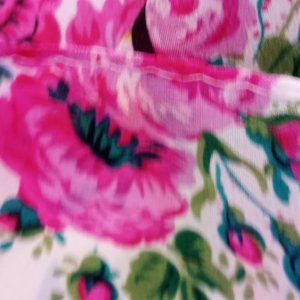 Vibrant colors, Pink/Greens/Blue/Yellow. Chintzy Cabbage roses, rosebuds on off white background