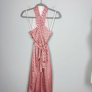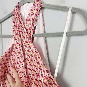 Beautiful midi dress by Club Monaco. Elegant floral print. Halter style neckline. Sash style belt tie. Back zipper closure. Colors are mostly in the pink/orange family. Great condition. Women’s size 2. Hits right under/at knee depending on height.