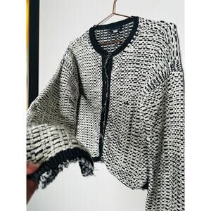 CLUB MONACO Black White Button-Front Fringe Cardigan Sweater in size Medium is a stylish and versatile layering piece. Made from a cozy knit fabric, this cardigan features a classic black-and-white color palette with textured fringe detailing that adds a modern, bohemian flair. The button-front closure and tailored silhouette ensure a polished look, while the fringe accents provide a touch of uniqueness. Perfect for both casual and dressy outfits, it pairs beautifully with jeans, trousers, or skirts for a chic and cozy ensemble.