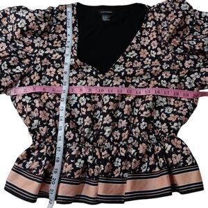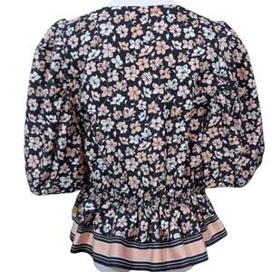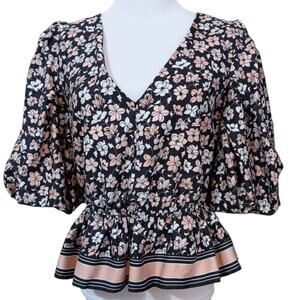 CLUB MONACO Floral Blouse Top L Peplum Puff Short Sleeves Pink Black Cottage